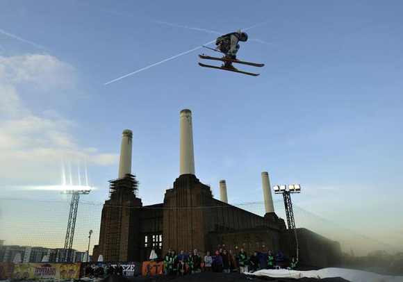 Freestyle skier Jossi Wells of New Zealand performs during the Freeze Festival at Battersea Power Station in London, England. Reuters Archive.