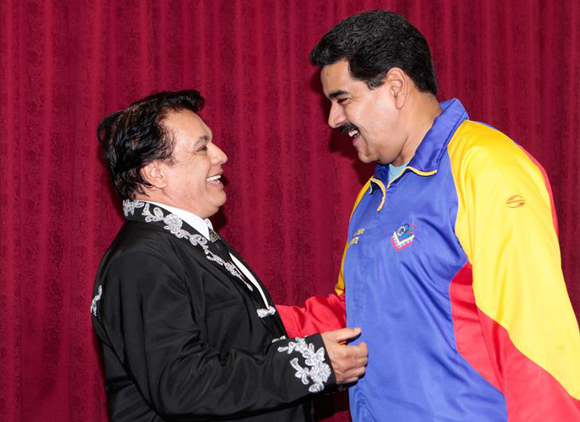Venezuela’s President Nicolas Maduro (R) welcomes Mexican singer Juan Gabriel at Miraflores Palace in Caracas, Venezuela. November 22, 2013.