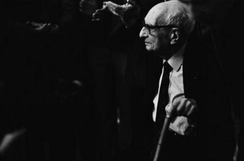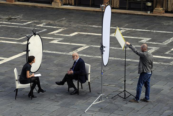 Belgian physicist Francois Englert (C) speaks during a television interview in Oviedo, Spain. October 23, 2013.
