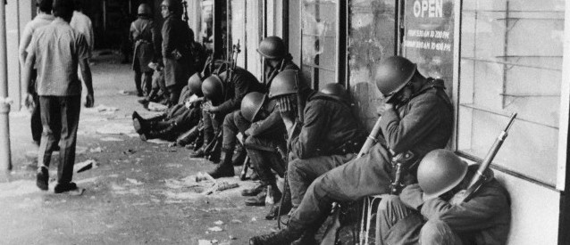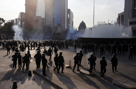 Riot policemen stand guard during a march marking the 45th anniversary of a student massacre in Mexico City. October 2, 2013.