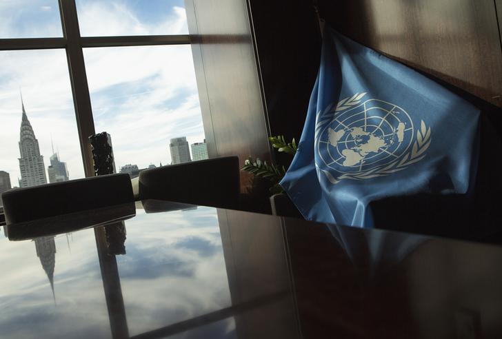 A United Nations flag is seen in a boardroom in the Secretariat building during the U.N. General Assembly at U.N.