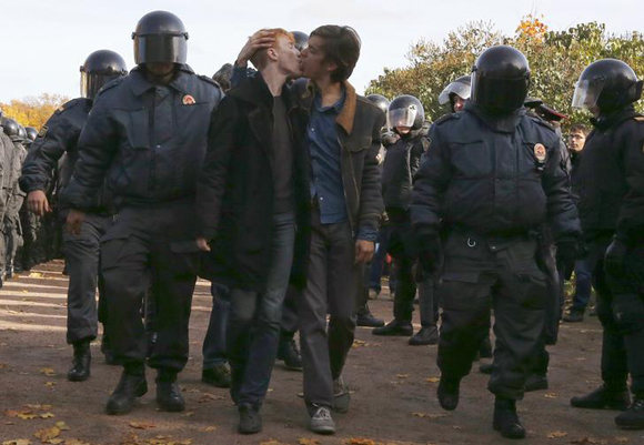 Gay rights activists kiss as they are detained by police officers during a gay rights protest in St. Petersburg, Russia. October 12, 2013.