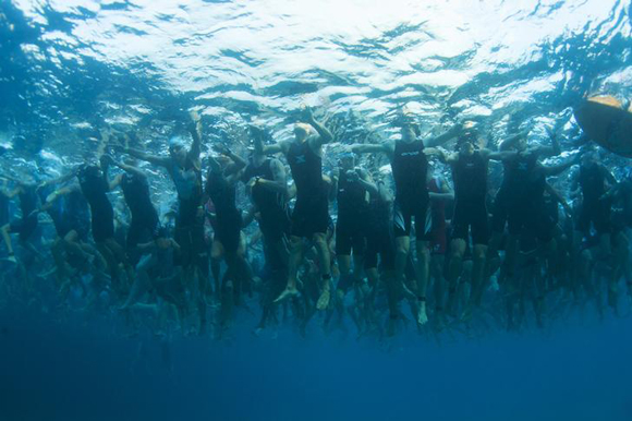 Amateur triathletes wait for the start of the 2.4 miles (3.86 km) swim portion during the Ironman World Championship in Kailua-Kona, Hawaii, USA. October 12, 2013.