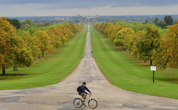 A man cycles past The Great Walk in Windsor Park,, with Queen Elizabeth’s residence, Windsor Castle, seen behind in Windsor, southern England. October 14, 2013.