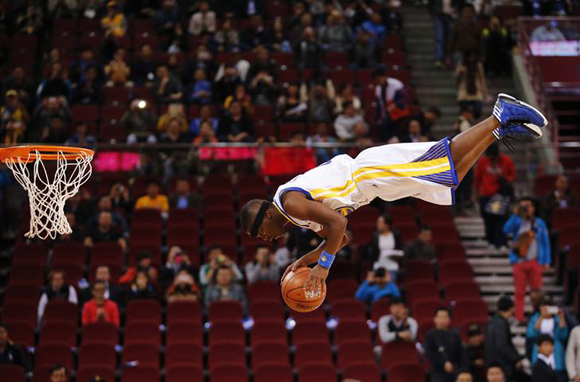 A member of the Flying Dubs, an acrobatic dunk team of the Golden State Warriors, performs before their NBA Global Game against the Los Angeles Lakers in Beijing, China. October 15, 2013.