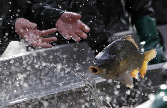 A fisherman throws a fish during the traditional carp haul in the village of Stankov, near the south Bohemian town of Trebon, Czech Republic. October 15, 2013.