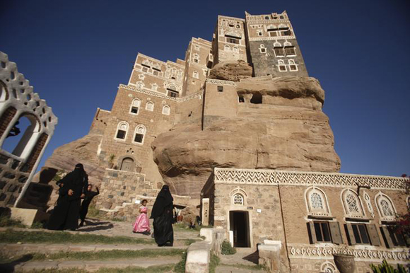 Women walk outside Dar al-Hajar (Rock Palace), one of Yemen’s most famous monuments, standing atop a rock hill in a valley 15 km (9 miles) northwest of capital Sanaa, Yemen. October 16, 2013.