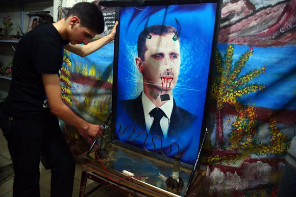 A youth plays with a game made from remnants of mortar shells and decorated with a defaced picture of Syria’s President Bashar al-Assad at a basement in the Duma neighbourhood in Damascus, on the second day of Eid al-Adha, Syria, October 16, 2013.