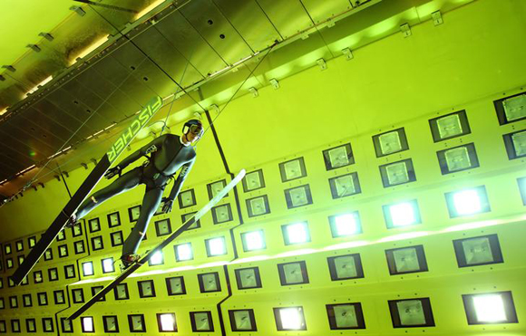 Austrian ski jumper Gregor Schlierenzauer makes a test jump into a 105 km/h (65 mph) headwind in the Railtec climatic wind tunnel in Vienna, Austria. October 17, 2013.