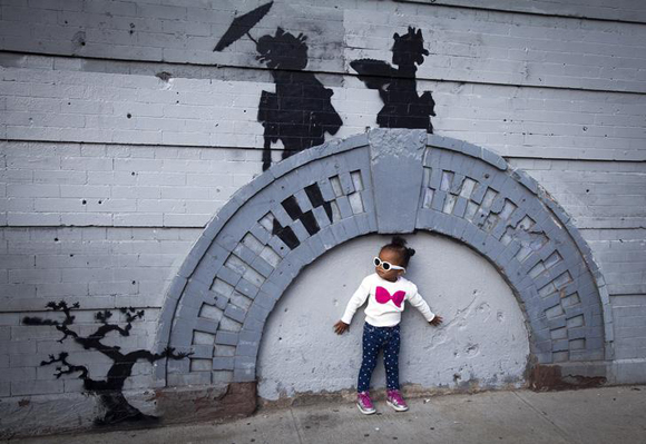 A child poses for a photo under a new art piece by British graffiti artist Banksy in the Brooklyn borough of New York, USA. October 17, 2013.
