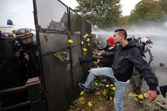Protesters kick barricades held by French riot police during a demonstration to maintain jobs in Quimper, western France. November 2, 2013.
