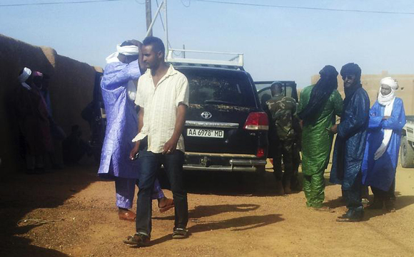 Members of MINUSMA and MNLA inspect the vehicle believed to have been ferrying two French journalists just after they were abducted in Kidal, Mali. November 2, 2013.