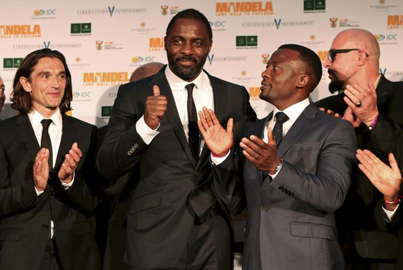 British actor Idris Elba (C), who plays former South African president Nelson Mandela in the movie «Mandela: Long Walk to Freedom», gestures next to actor Tony Kgoroge who plays anti-apartheid activist Walter Sisulu, as British director Justin Chadwick (L) looks on, at the film’s premiere in Johannesburg, South Africa. November 3, 2013.