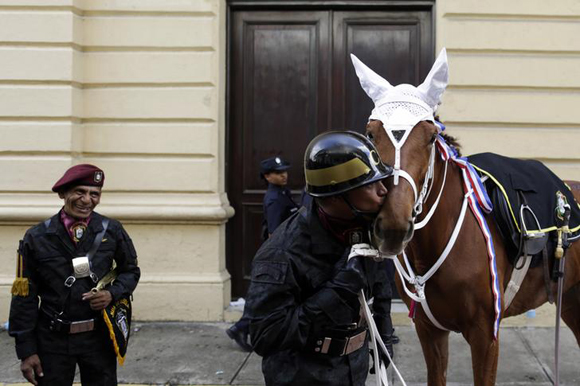A police officer kisses his horse ahead of a parade to celebrate the 110th anniversary of Panama’s separation from Colombia, in Panama City. November 3, 2013.