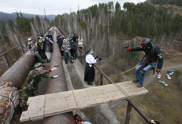 Members of the «Exit Point» amateur rope-jumping group stage a performance as they jump from a 44-metre high (144-ft) waterpipe bridge in the Siberian Taiga area outside Krasnoyarsk, Russia. November 3, 2013.