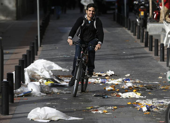 A cyclist rides through garbage strewn about on the pavement on the first day of an indefinite strike by street cleaners in central Madrid, Spain. November 5, 2013.