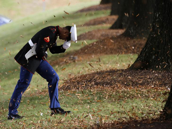 U.S. Marine holds his hat as U.S. President Barack Obama (unseen) lands inside Marine One at Walter Reed National Military Medical Center in Bethesda, Maryland, USA. November 5, 2013.