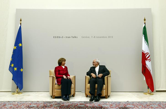 European Union foreign policy chief Catherine Ashton (L) speaks with Iranian Foreign Minister Mohammad Javad Zarif during a photo opportunity before the start of two days of closed-door nuclear talks at the United Nations European headquarters in Geneva, Switzerland. November 7, 2013.