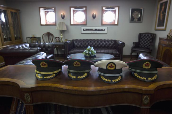 China’s People’s Liberation Army (PLA) personnel leave their hats during a tour of the U.S. Navy aircraft carrier George Washington in the South China Sea. November 7, 2013.