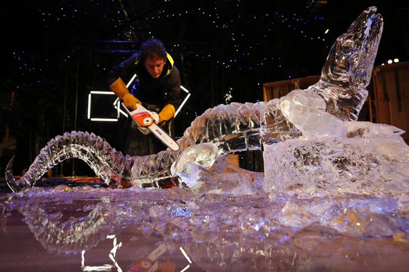 An artist from the company «La Machine» uses an electric chain saw to complete a performance where they created an ice sculpture in the form of a lizard, in Nantes, France. December 28, 2013.