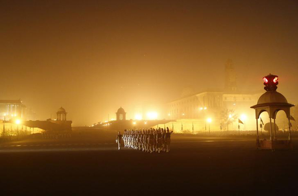 Indian soldiers march as they rehearse for the Republic Day parade amid fog on a cold winter morning in New Delhi, India. January 2, 2014.