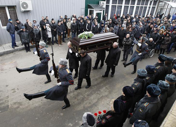 Pallbearers carry the coffin during the funeral honors of Russian police senior sergeant Dmitry Makovkin who was killed by a suicide bomb blast in the city main railway station in Volgograd , Russia. January 2, 2014.