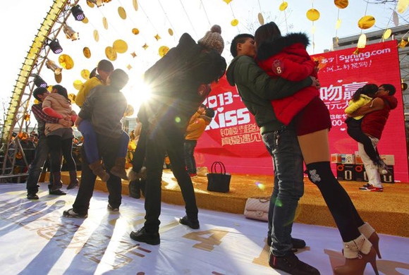 Couples kiss during a contest on New Year’s Eve in Xi’an, Shaanxi province, China. December 31, 2013.