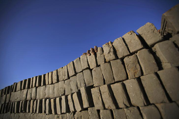 The fingers of Rahul Maji, 12, who lives and works with his family at a brick factory, is pictured as he works in Kathmandu, Nepal. January 2, 2014.