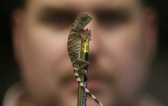 Keeper Ben Baker looks at a Bell’s Anglehead Lizard as it sits on the end of his pencil during a photocall for the annual stocktake at Chester Zoo in Chester, northern England. January 2, 2014.