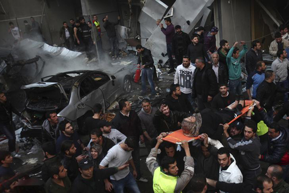 People carry a wounded woman on a stretcher at the site of an explosion in Beirut’s southern suburbs, Lebanon. January 2, 2014.