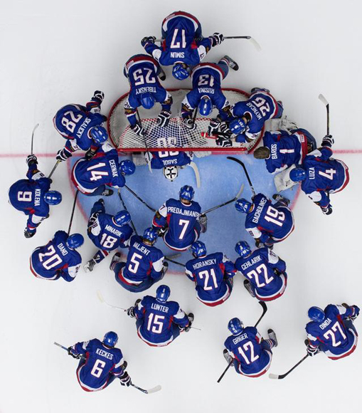 The Slovakian team pep ups around their goalie prior to the World Junior Hockey Championships quarter final match against Sweden at the Malmo Arena in Malmo, Sweden. January 2, 2014.