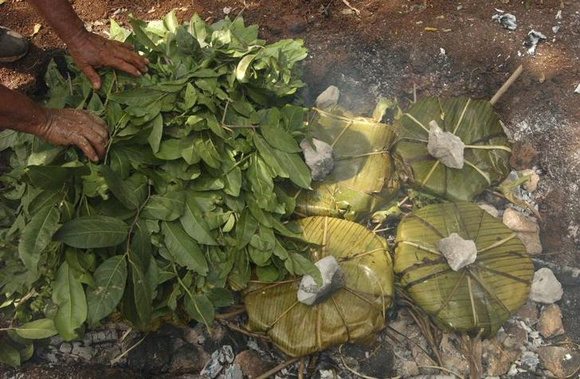 Mayan Indian Angel Barrancos buries «pibipollos» or special offerings of food to the dead with leaves, before leaving them to cook on hot stones and coal in a hole in the ground, in the village of Pomuch in Mexico’s Yucatan peninsula, Mexico. Reuters Archive