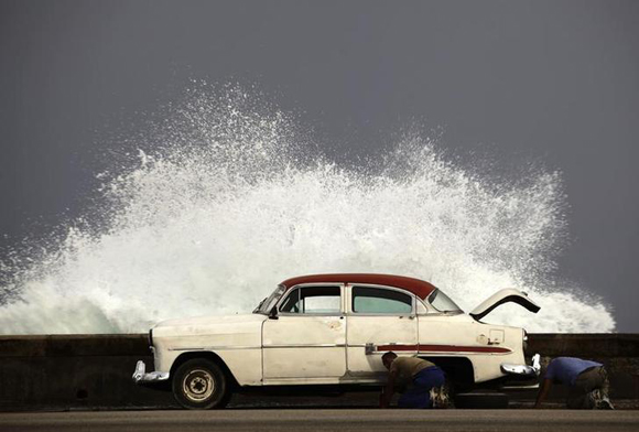 Men change a flat tyre of their car on Havana’s seafront boulevard as a wave crashes, cuba. Reuters Archive