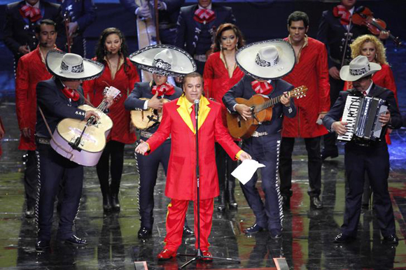 Mexican singer Juan Gabriel, dressed as «El Chapulin Colorado», performs during the tribute to Mexican comedian and director Roberto Gomez Bolanos, «America celebrates Chespirito,» in Mexico City, Mexico. Reuters Archive.