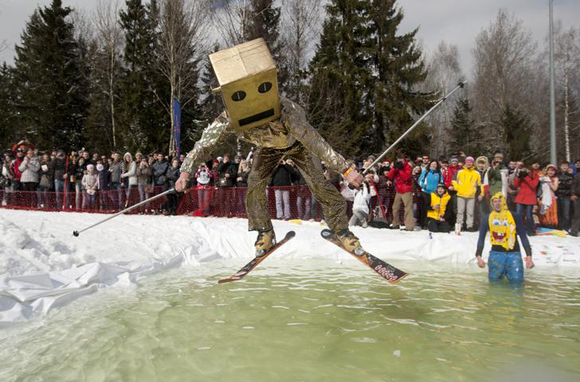 A skier jumps into a pool of water while taking part in an event to mark the closing of the ski season at Silichi ski resort, some 30 km (18 miles) outside the Belarussian, Belarus. Reuters Archive