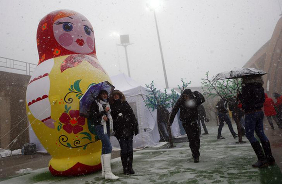 Visitors brave heavy snowfalls as they attend a World Cup race held as a bobsleigh test event at the «Sanki» sliding center in Rosa Khutor, a venue for the Sochi 2014 Winter Olympics near Sochi , Russia. Reuters Archive.