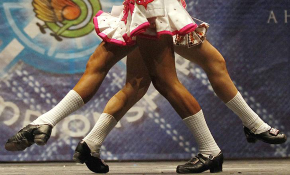 Two dancers pass each other as they compete in a heat during the All Scotland Championships in Irish Dancing at the Royal Concert Hall in Glasgow, Scotland. Reuters Archive