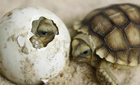 A baby sulcata turtle cracks its eggshell in Servion near Lausanne, Switzerland. Reuters Archive