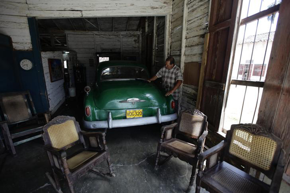 Fidel Roque polishes the U.S.-made 1952 Chevrolet car he affectionately named Miss Green, and parks in his living room in the village of Sagua La Grande, Cuba. Reuters Archive