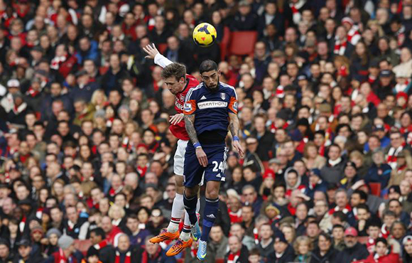 Fulham’s Ashkan Dejagah (R) challenges Arsenal’s Nacho Monreal during their English Premier League soccer match at the Emirates stadium in London. January 18, 2014