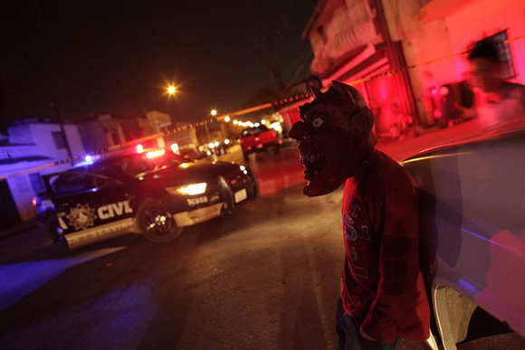 A man wearing a devil’s mask poses for a picture at a crime scene in Monterrey, Mexico. January 20, 2014