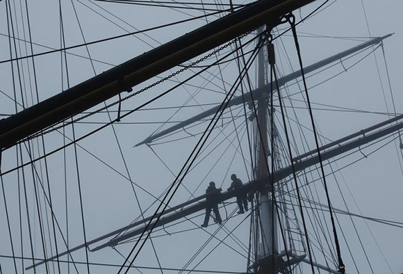 People work on the masts and rigging of the Cutty Sark at Greenwich in London, England. January 21, 2014