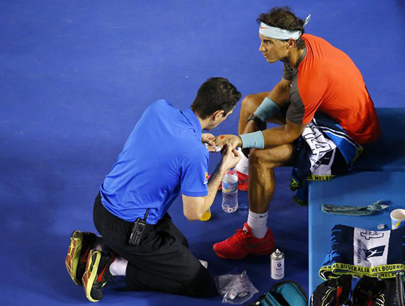 Rafael Nadal of Spain receives medical treatment during his men’s singles semi-final match against Roger Federer of Switzerland at the Australian Open 2014 tennis tournament in Melbourne, Australia. January 24, 2014.