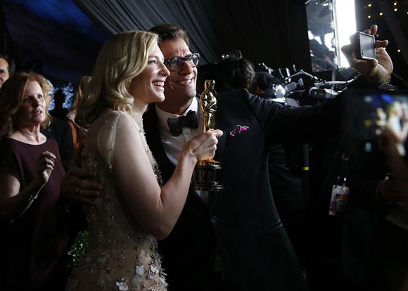 Cate Blanchett (L), winner for best actress for her role in the film «Blue Jasmine», poses for a «selfie» with a reporter at the Governors Ball for the 86th Academy Awards in Hollywood, California, USA. March 2, 2014.