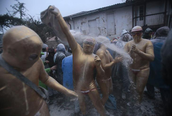 Revellers participate in a flour fight during the «O Entroido» festival in Spain’s northwestern village of Laza. March 3, 2014.