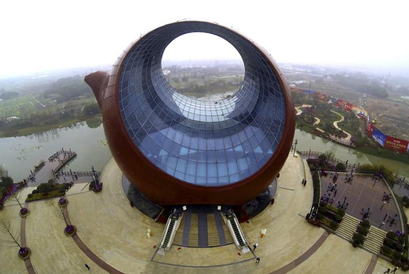 An aerial view of a building shaped like a clay teapot is seen in Wuxi, Jiangsu province, China. March 4, 2014.