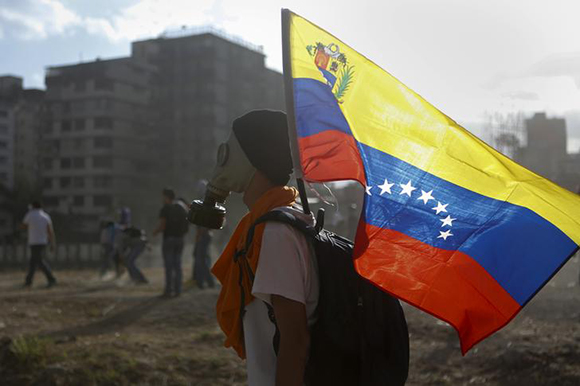 An anti-government protester with a Venezuelan national flag stuck behind his back takes part in a protest at Altamira Square in Caracas, Venezuela. March 4, 2014.