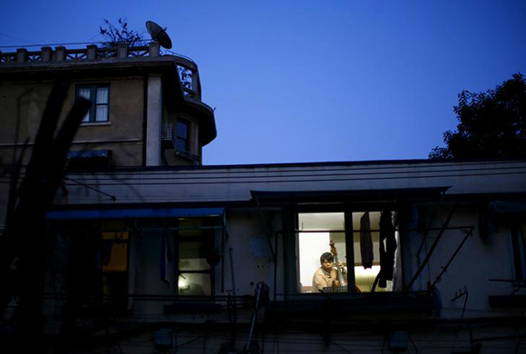 A man plays a double bass inside an apartment at a residential area in Shanghai, China. March 5, 2014.