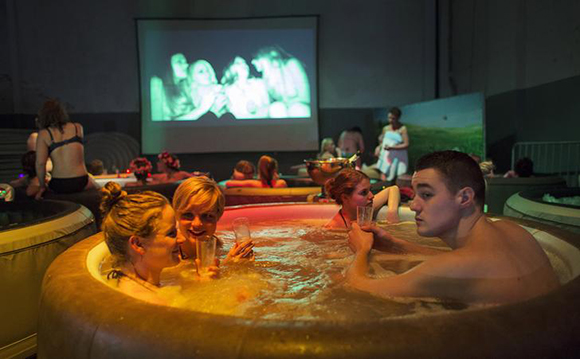 Movie fans enjoy a hot bubble bath while watching a movie at the Hot Tub Movie Club in Amsterdam, The Netherlands. March 6, 2014.
