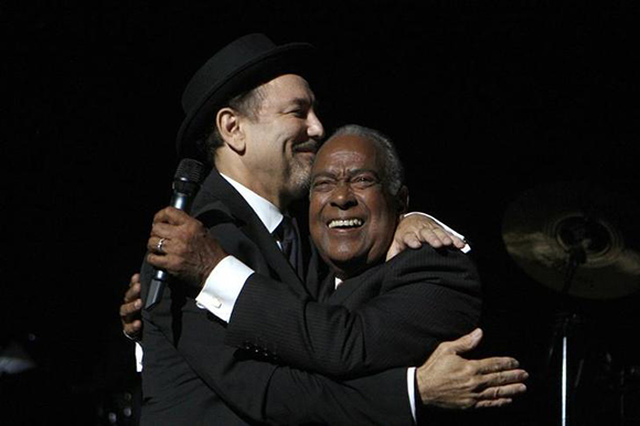 Panamanian salsa singer-song writer Ruben Blades (L) hugs Puerto Rican salsa singer Jose «Cheo» Feliciano during Blades’ initial concert of his new tour «Todos Vuelven» at the Puerto Rico Coliseum in San Juan. Reuters Archive.